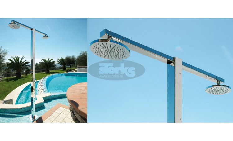 Außendusche mit 2 Duschköpfen: - mit zeitlich begrenztem Selbstschlussventil. AUSSTATTUNG - Säule: Inox-Stahl Aisi 316, Stärke 2 mm - Bodenflansch: Inox-Stahl Aisi 316, Stärke 5 mm - Bodenbefestigung mit Gewindestangen, Muttern und Unterlegscheiben, alle aus Inox-Stahl Aisi 316 TECHNISCHE INFORMATIONEN Wasserversorgung: abhängig von Ihrer Auswahl eines Öffnungsmechanismus empfohlener Fließdruck: 1 ÷ 5 Bar Standard-Wasserversorgung über Bodenanschluss: ½ "F