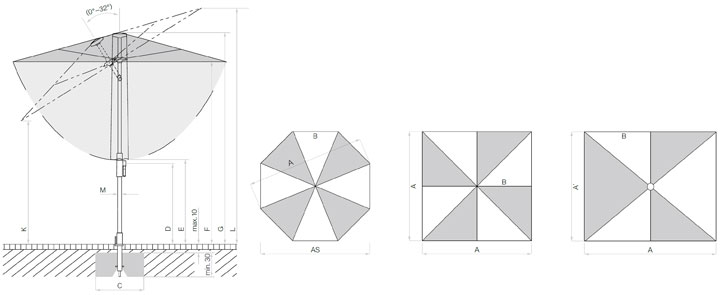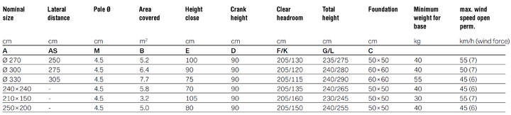 The max. wind speed limits as per our separate sheet apply only if the parasol canopy is in a horizontal position and if there is a fixed ground anchorage.