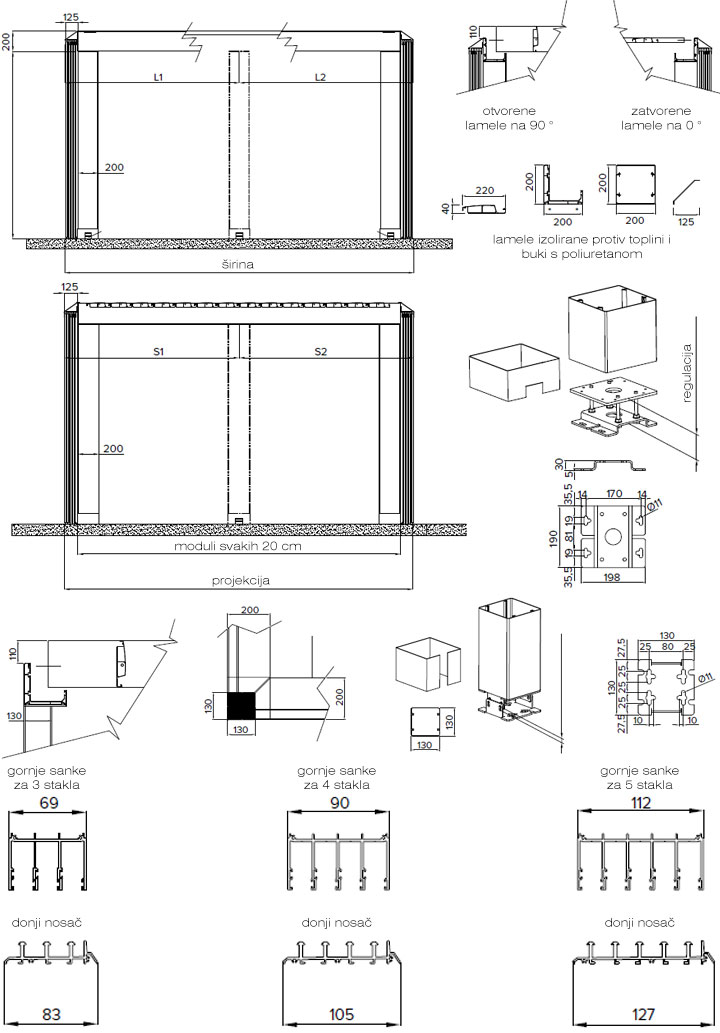 Najveće dimenzije: širina 4,75 m x projakcija 8,25 m s 4/6 stupova dimenzije 20x20 cm.