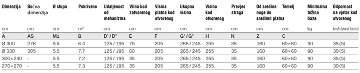 8 aluminijskih šipki sa polugnim mehanizmom (vitlo) i integriranom polugom za nagib za jednostavno dvostrano naginjanje suncobrana do 90°. Stup je okrugli, 55 × 2,5 mm. Vitlo se može ukloniti.