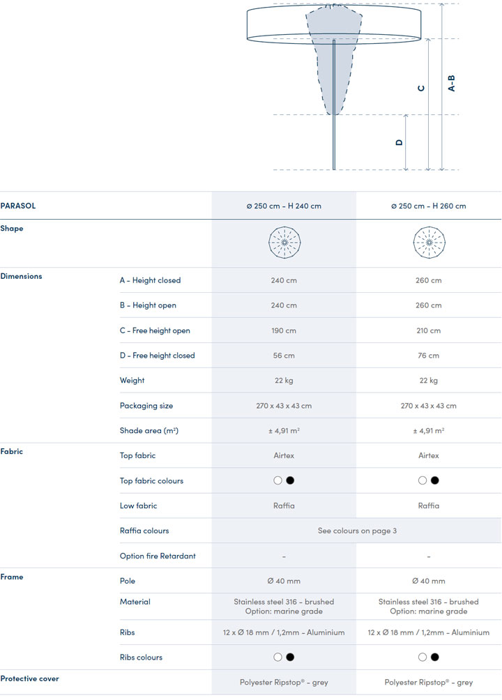 Frou Frou je okrugli suncobran. Stup je izrađen od nehrđajućeg čelika i pričvršćen je u čeličnu temeljnu ploču.