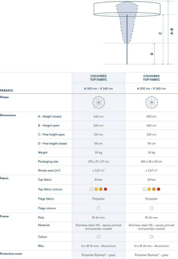 Okrugli suncobran sa 12 rebara, promjera 3 m.