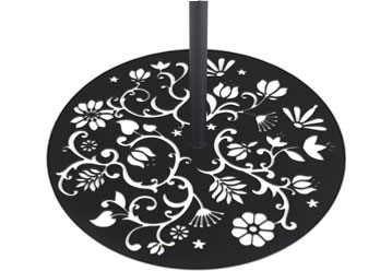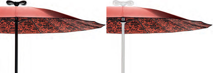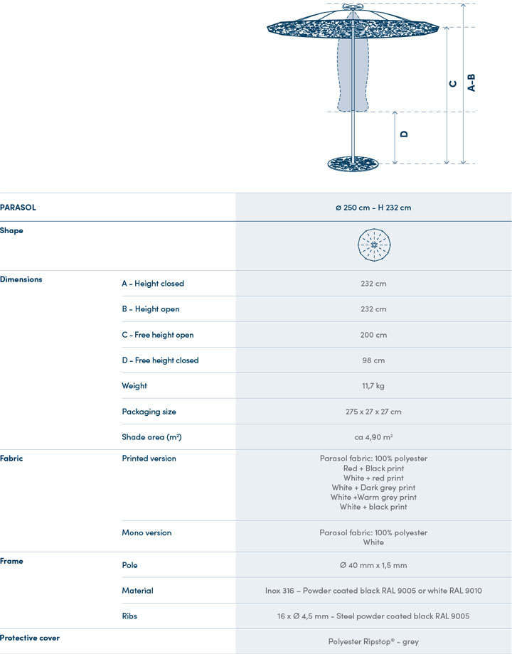 Suncobran Marcel Wanders Geisha je okrugao. Stup je izrađena od nehrđajućeg čelika i pričvršćena je u čeličnu temeljnu ploču.