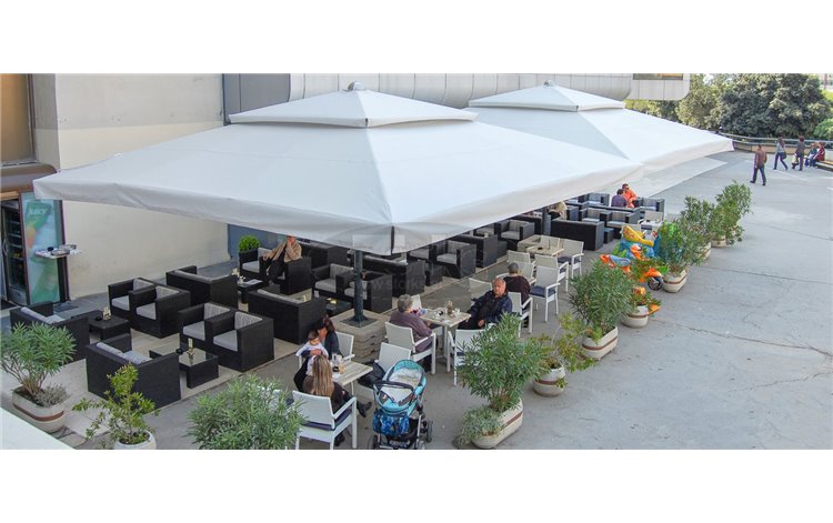 Ogroman suncobran koji se ne može previdjeti. Kao napredak u liniji s više nadstrešnica, ovaj suncobran je pravi inženjerski podvig. Ovaj suncobran posebne klase, koji se sastoji od četiri nadstrešnice kombinirane na jednom stupu, impresivan je zbog svojih dimenzija i stabilne konstrukcije.Svojim impresivnim izgledom i sofisticiranim finišom, suncobran na Quadro idealno je rješenje ako vam je potrebna zaštita od sunca i kiše na velikim površinama. Kišni oluk je također standard.