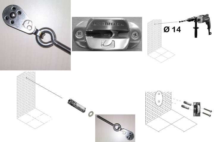 Omogućuje instalaciju na na visokom mjestu zida.Uključuje i oko koje se pritvrdi na zid i zidnu jedinicu sa držačem užeta.materijal: inox upozorenje: Vijci koji su uključeni nisu prikladni za sve površine.