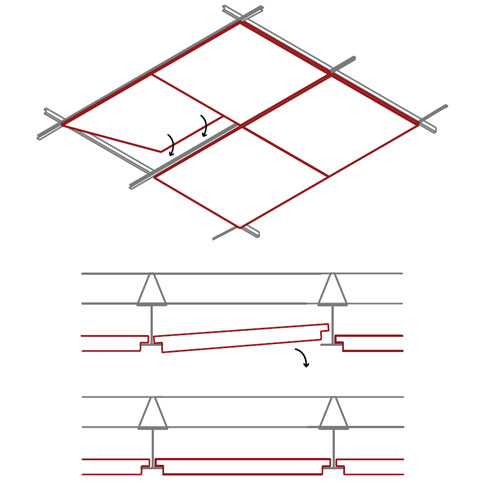 Paneli se lahko vgradijo na strop, ki jih zavarujemo z mrežo (spuščeni strop Armstrong) ali na zid.