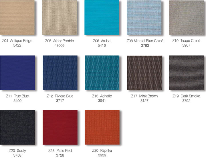 Pri procesu proizvodnje vlakna je dodana barva kar zagotavlja visoko odpornost prozi UV žarkom prav tako na agresivnih področjih kjer je prisoten klor ali sol. Barve ne obledijo in ostanejo obstojne daljše obdobje, prav tako je blago odporno na vlago. S posebnim postopkom dosežemo vodoodbojnost in zaščito proti madežem. Periodično krtačenje ohranja originalen videz. UPF 50+ (UV faktor zaščite).