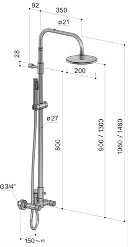 Stenski tuš z mešalnim ventilom, stebrom, tušem in ročnim tušem.TEHNIČNE INFORMACIJEpriporočen pritsk vode: 1 ÷ 5 bara