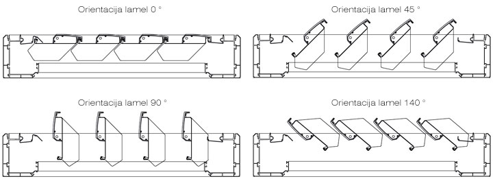 Streha iz aluminijastih lamel L oblike 4 x 22 cm, ki se enostavno orientirajo od 0 ° do 140 °, skupaj s tesnili in stranskim odtokom vode.