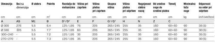 Odpornost na veter, kot na zgornjem seznamu je pravilno le v primeru montaže senčnika z nosilcem za v beton in primernim temeljem.