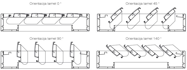 Streha iz aluminijastih lamel L oblike 4 x 22 cm, ki se enostavno orientirajo od 0 ° do 140 °, skupaj s tesnili in stranskim odtokom vode.