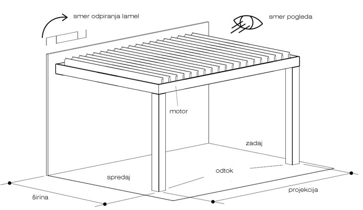 Odtok vode z vseh strani pergole L oblike 20 x 20 cm. Za odtok deževnice so prilagojeni stranski stebri.