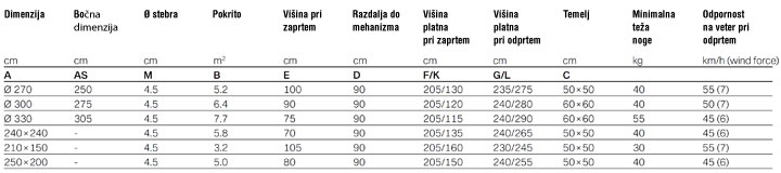 Največja omejitve hitrosti vetra veljajo le, če je klobuk senčnika v vodoravnem položaju in če je fiksno pritrjen na tla.