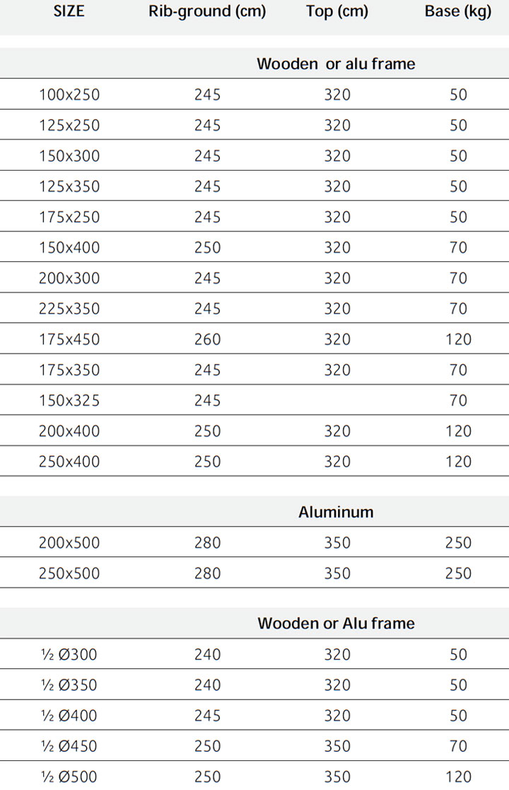 Najkakovostnejše surovine se v naših objektih spremenijo v umetniška dela - želimo zagotoviti, da se konstrukcija počuti tako zanesljivo in razkošno. Naši aluminijasti okvirji so na zahtevo prevlečeni s prahom ali eluksirani. Za vse senčnike do velikosti 4 × 4 m z ventilom so lahko rebra izdelana iz lesa Iroko ali aluminija. Večje dežnike in dežnike s patentiranim sistemom Split Solution je mogoče izdelati samo z aluminijastimi rebri. Vse druge kovinske komponente so pocinkane in prašno barvane (razen aluminijastih reber in senčnikov iz nerjavečega jekla so polirana).