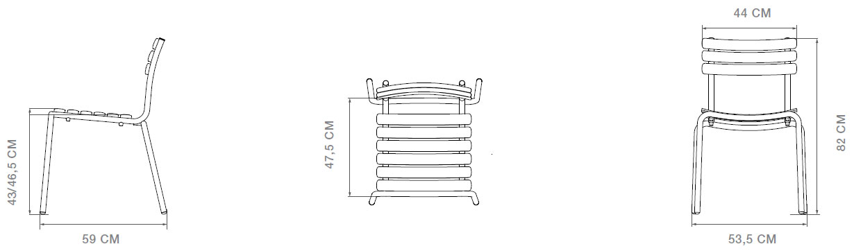 ALUA je na voljo v 6 barvah in ponuja izbiro med modeli z ali brez naslonjal za roke. Zasnovan je za enostavno zlaganje, saj lahko zložite do 10 kosov.