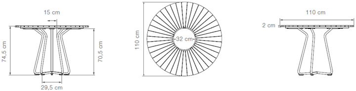Kombinacije prašno lakiranega jekla ali aluminija, bambusa in danskega gospodinjskega plastičnega odpada ustvarjajo zbirko dobro oblikovanih zunanjih jedilnih miz, ki se popolnoma ujemajo s HOUE jedilnimi stoli.