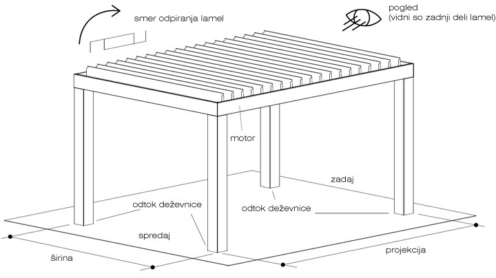 Streha iz aluminijastih lamel širine 22 cm in višine 4 cm, ki jih je mogoče usmerjati od 0° do 120°.